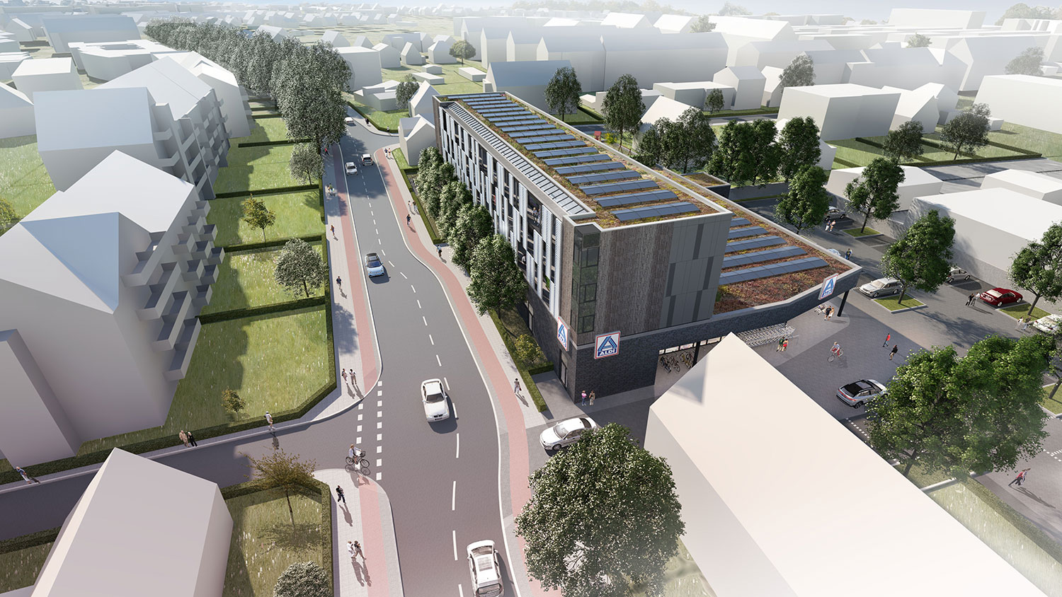 Der Bauherr ist mit dem Wunsch an uns herangetreten, einen Verbrauchermarkt in Verbindung mit Wohnungen in Holzmodulbauweise als Pilotprojekt zu entwerfen.