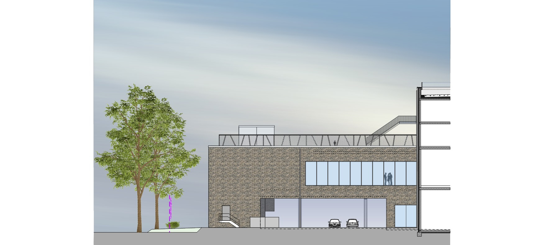 Um die für den Verbrauchermarkt und die Kita erforderlichen 35 KFZ-Stellplätze auf dem verhältnismäßig kleinen Grundstück unterbringen zu können, werden diese, sowie auch die Anlieferung des Marktes in der Erdgeschossebene untergebracht.