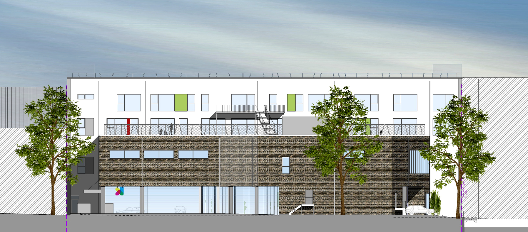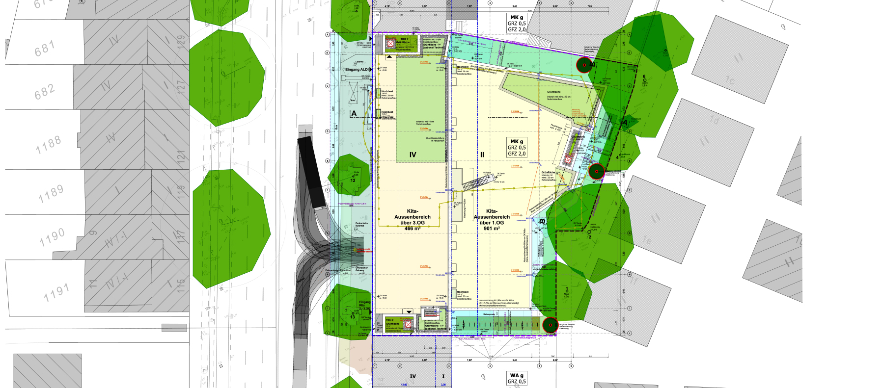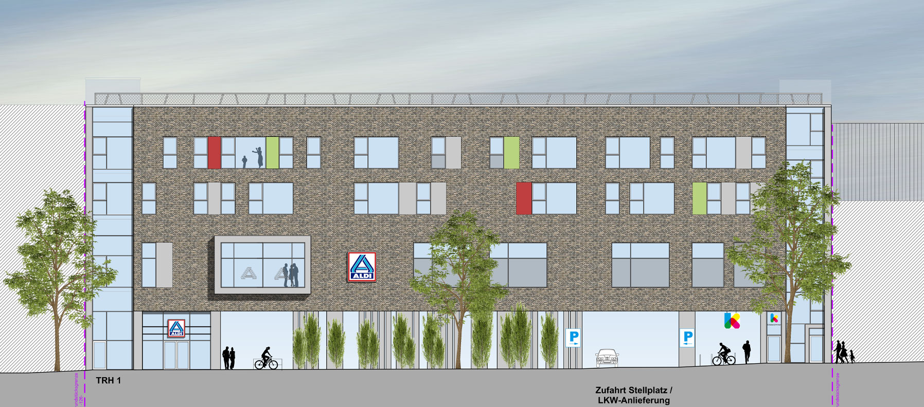 Auf dem Grundstück eines alten Discount-Marktes in einem ehemaligen Kino, das inzwischen rechts und links von einer 4- bis 6-geschossigen, straßenbegleitenden Bebauung eingefasst ist, soll der Verbrauchermarkt neu gestaltet und darüber hinaus Raum für eine neue Kindertagesstätte geschaffen werden.