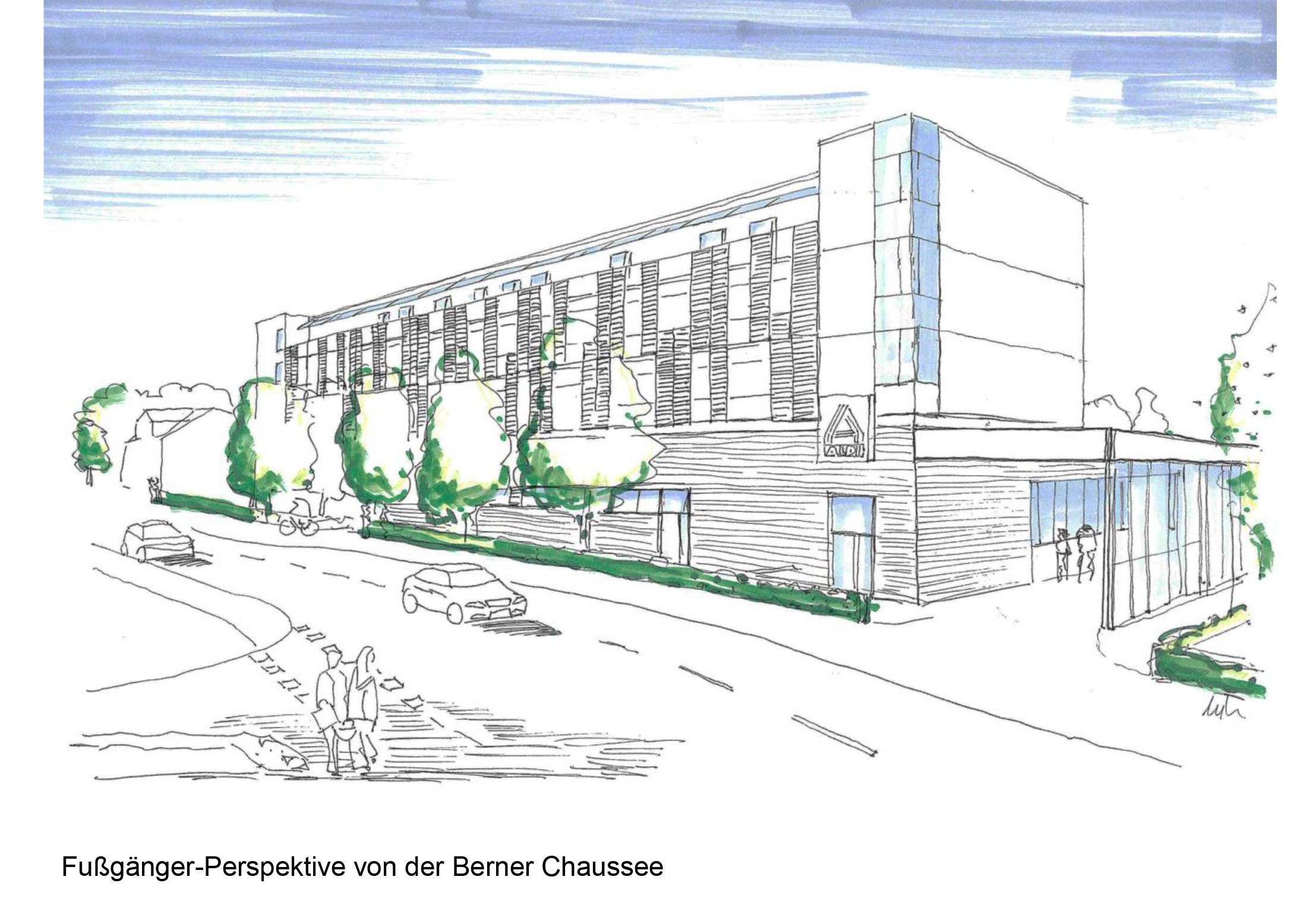 Städtebaulich präsentiert sich das Umfeld beidseitig der Straße mit einer klar definierten, geraden Gebäudeflucht aus ein- bis fünfgeschossigen Gebäuden, die traufständig parallel zur Straße angeordnet sind. Mit dem Neubau haben wir diese städtebauliche Kante aufgenommen und damit der gegenüberliegenden Straßenseite eine entsprechende, klar definierte Linie entgegengesetzt, so dass ein klarer und harmonischer Lückenschluss entsteht, der die vorhandene Straßenflucht sinnvoll ergänzt.
