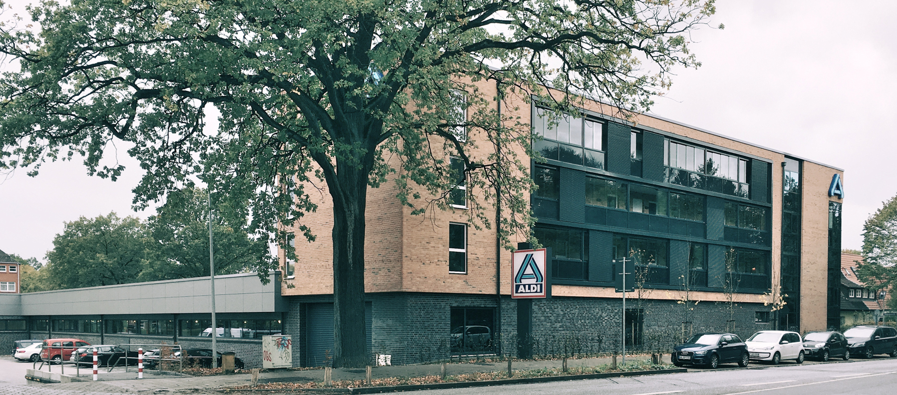 Im Dialog mit der Stadtplanung Hamburg entstand parallel zur Langenhorner Chaussee angeordnet ein dreigeschossiger Gebäuderiegel mit insgesamt 15 Wohnungen oberhalb eines eingeschossigen Verbrauchermarktes.